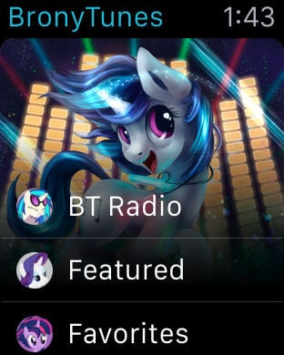 BronyTunes is the way to listen to all your favorite songs by brony musicians, all in one place, available anywhere and anytime!• Play what you want, when you want.Listen to hits by fandom musicians like Odyssey (Eurobeat Brony), EileMonty, The Living Tombstone, Aviators, BlackGryph0n, MathematicPony, Vocal Score Pony, Glaze (WoodenToaster), Forest Rain, Poni1Kenobi, dBPony, Replacer, Cyril the Wolf, d.notive, and many, many more!• The hits you love, undiscovered gems, and everything in between.With songs from the best artists spanning every genre, you'll find it all on BronyTunes Radio.• Easy on your ears. And your data plan.When you stream music from any app, audio files are downloaded by your device over Wi-Fi or your cellular data connection. And normally, to hear a song again, it has to be downloaded again and again each time. It shouldn't have to be this way!With BronyTunes' Smart Caching feature, the app can keep a copy of the songs you play without using any more data than what it takes to play the song. When you want to hear that song again, you no longer need to use any data, which also means that you can listen online. Rock on! /)