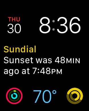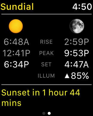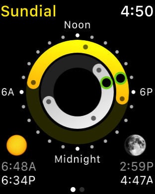 Sundial is the app you didn't know you needed, showing vital info about the sun and moon any time, anywhere. Never wonder when the sun will set or rise again!Tracking the sun and moon is something people have done for thousands of years but it's never been easier than it is today with Sundial. Sundial puts solar and lunar information into the palm of your hand and, thanks to the Apple Watch app, onto your wrist as well!Sundial is an app designed to give everyone access to the sun and moon in ways they don't normally have it. Perfect for runners, hikers, campers, boaters, sailors, pilots, gardeners, farmers, photographers, film/tv production crew, astronomers, astrophotographers, solar installers, and travelers of all kinds. Sundial is an app for anyone who just needs to know when it'll get light and dark.Sundial provides a one-of-a-kind display of the sun and moon's rise and set cycle over the 24-hour day. As the seasons change, the yellow Òsun is outÓ arc informs you of the precious daylight hours, shrinking during winter months and expanding as summer approaches. The white inner arc represents when the moon is visible in the sky. Civil, nautical, and astronomical twilights are also shown on the solar dial in shades of blue.Create alerts for one of 24 different solar and lunar events and Sundial will tell you about them Ð without you ever having to open the app.The 24 events that support notifications include:- Sunrise, solar mid-morning, solar noon, solar mid-afternoon, sunset, and solar midnight- Civil twilight (dawn/dusk), nautical twilight, and astronomical twilight- Moonrise, lunar noon, moonset, and lunar midnight- Moon phases: full moon, new moon, first quarter moon, and last quarter moon- Astronomical seasons: March equinox, June solstice, September equinox, and December solsticeAll notifications can be customized to alert you minutes, hours, and even days before an event takes place. Sundial can give you plenty of notice that you need to be ready for a sunrise, sunset, and more. Like to walk your dog for 30 minutes before dusk? Sundial can help you with that!There's more, too!TIME TRAVELUse Sundial's 24-hour wheel to see where the sun and moon will be today, tomorrow, and any other time you choose. Use gestures on iPhone and iPad to scroll through dates. Or jump to a specific date with iPhone, iPad, and Apple Watch.WIDGETSSundial features 35 different home and lock screen widgets. Most are customizable.APPLE WATCH APPThe Sundial Apple Watch app makes all of its solar and lunar data available where it's most easily found Ð right on your wrist. Because Sundial runs on your watch you won't even need to have your iPhone with you.Hundreds of complication combinations mean you'll find one that displays the right data and has the right look Ð even for the most custom of watch faces. Sundial's unique time dials, solar times/countdown, lunar times/countdown, moon phase, and solar/lunar azimuth are all present on Apple Watch.ACCESSIBILITYWe want to make sure everyone can enjoy Sundial which is why we built in full Voice Over support from the ground up.PRIVACYWe believe that your data is your own. That's why Sundial doesnÕt collect any information about the people who use it. Sundial does not store your location or upload it to any third-party service.SUNDIAL EXTRASSundial is a free download with some additional features requiring an in-app purchase to unlock. Included when you purchase Sundial Extras:- iPhone/iOS: unlimited alerts, unlimited Time Travel, support for multiple locations, & more.- 35 configurable home, lock screen, and standby widgets.- Apple Watch app, including hundreds of complications + widgets. watchOS 7 or higher required.You can try above free for 3 days, after which you can choose to purchase Sundial Extras via on-time purchase, or continue to use the free features. Sundial Extras is NOT a subscription and you will never be charged without your consent.