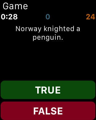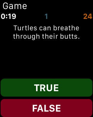 True Or False - AnimalzA Watch-App Animal-Quiz with countless interesting and funny questions you can answer by tap on true or false. Learn some strange facts from the animal world.Do you know everything on animals? Test your skills! You have 30 seconds, or optional in the settings menu up to one minute, to solve as many fact-questions as you can. There are up to 150 facts randomly presented so you have countless hours of fun and stunning.An other fine «Z-App» from Skullz23.